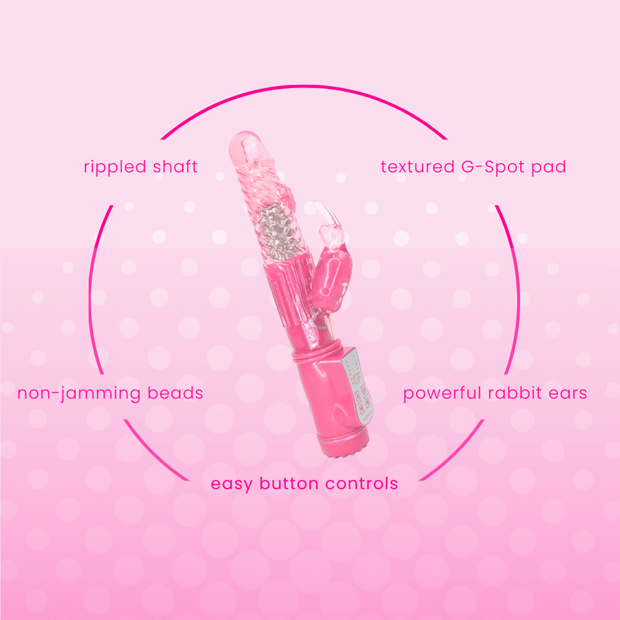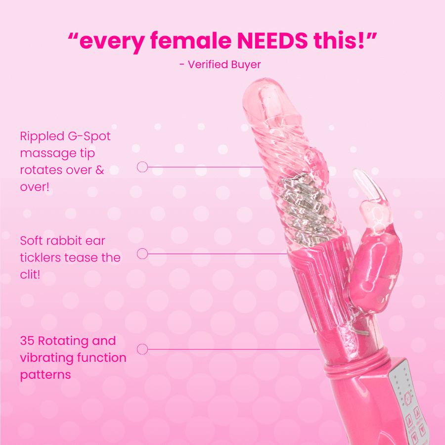 - Lay Down & Massage:Â Laying flat on your back, find a comfortable position and insert the rotating shaft to rub & massage your G-Spot over and over again. At the same time, the powerful rabbit ears will tickle and tease your clit!